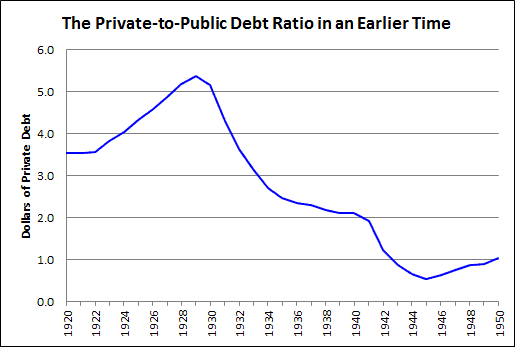 From 1920 to 1928, private debt grew at an average rate of 5.4% per year. Public debt was not growing.
